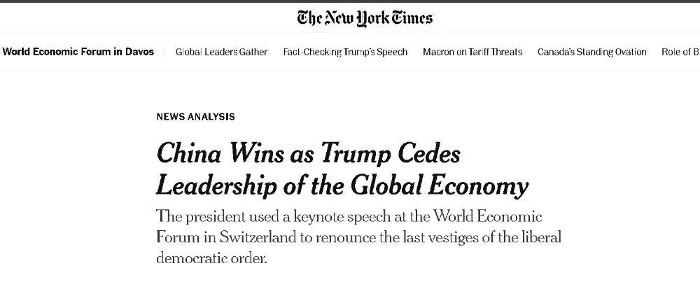 值得一提的是,就在华莱士-威尔斯的这篇文章刊登出来的次日,《纽约时报》一位负责报道达沃斯世界经济论坛的记者,写下了一篇对比美国和中国在达沃斯获得的反响和期待的文章。